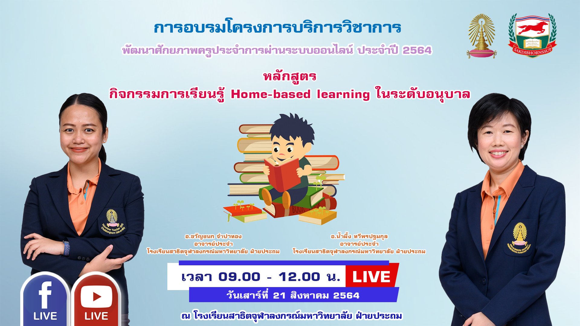 - ประกาศรายชื่อผู้เข้าอบรมออนไลน์ : วันเสาร์ที่ 21 สิงหาคม 2564 เวลา 9.00-12.00 น. วิทยากร : ศาสตราจารย์กิตติคุณ อัจฉรา ชีวพันธ์ อาจารย์พรพิตร สกุณา รองศาสตราจารย์จรัสศรี พัวจินดาเนตร
