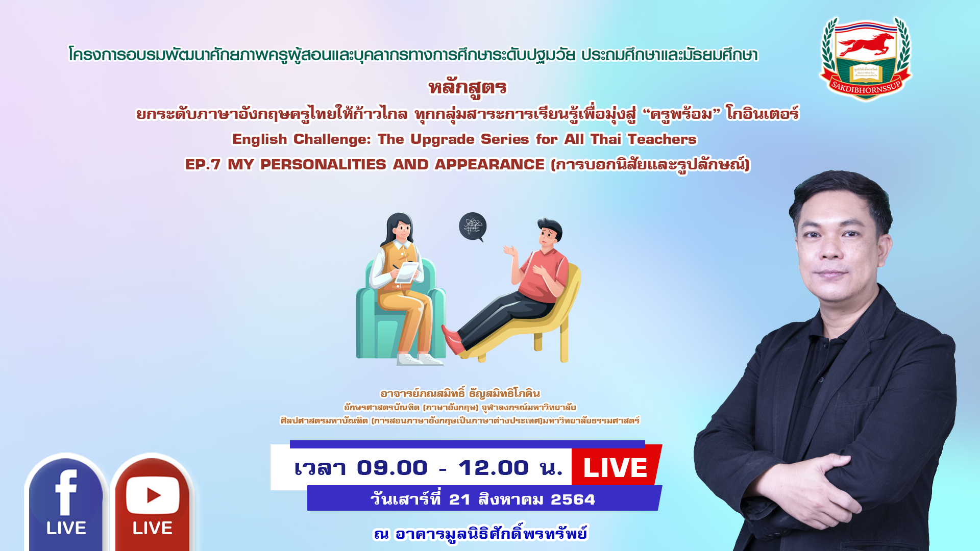 ยกระดับภาษาอังกฤษครูไทยให้ก้าวไกลทุกกลุ่มสาระการเรียนรู้เพื่อมุ่งสู่ “ครูพร้อม” โกอินเตอร์ English Challenge: The Upgrade Series for All Thai Teachers EP.7 MY PERSONALITIES AND APPEARANCE (การบอกนิสัยและรูปลักษณ์)