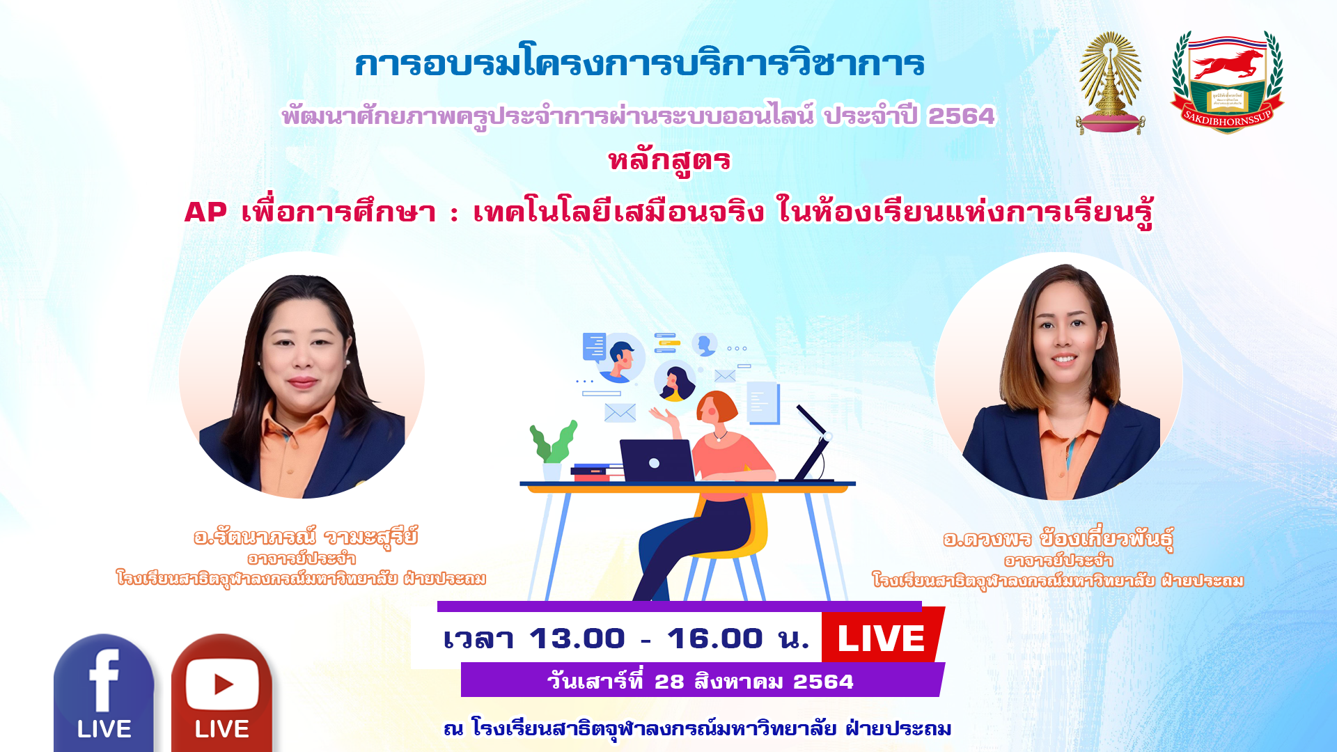 - ประกาศรายชื่อผู้เข้าอบรมออนไลน์ : วันเสาร์ที่ 28 สิงหาคม 2564 เวลา 14.00-17.00 น. วิทยากร : อาจารย์ปุณทิศา กลัดทอง