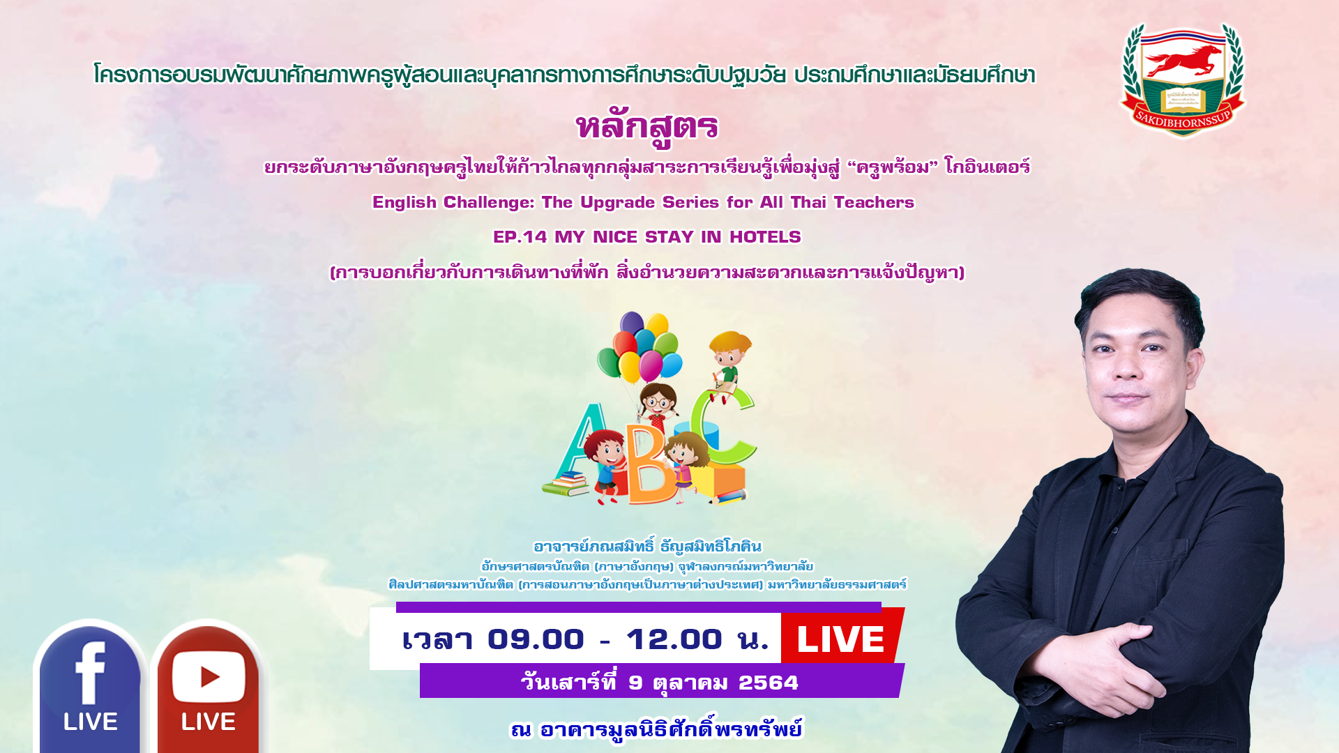 : ยกระดับภาษาอังกฤษครูไทยให้ก้าวไกลทุกกลุ่มสาระการเรียนรู้เพื่อมุ่งสู่ “ครูพร้อม” โกอินเตอร์ English Challenge: The Upgrade Series for All Thai Teachers EP.14 MY NICE STAY IN HOTELS (การบอกเกี่ยวกับการเดินทาง ที่พัก สิ่งอำนวยความสะดวกและการแจ้งปัญหา)