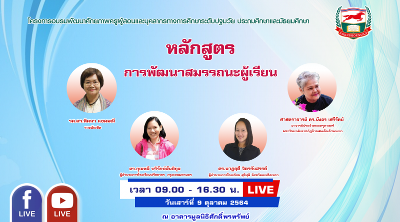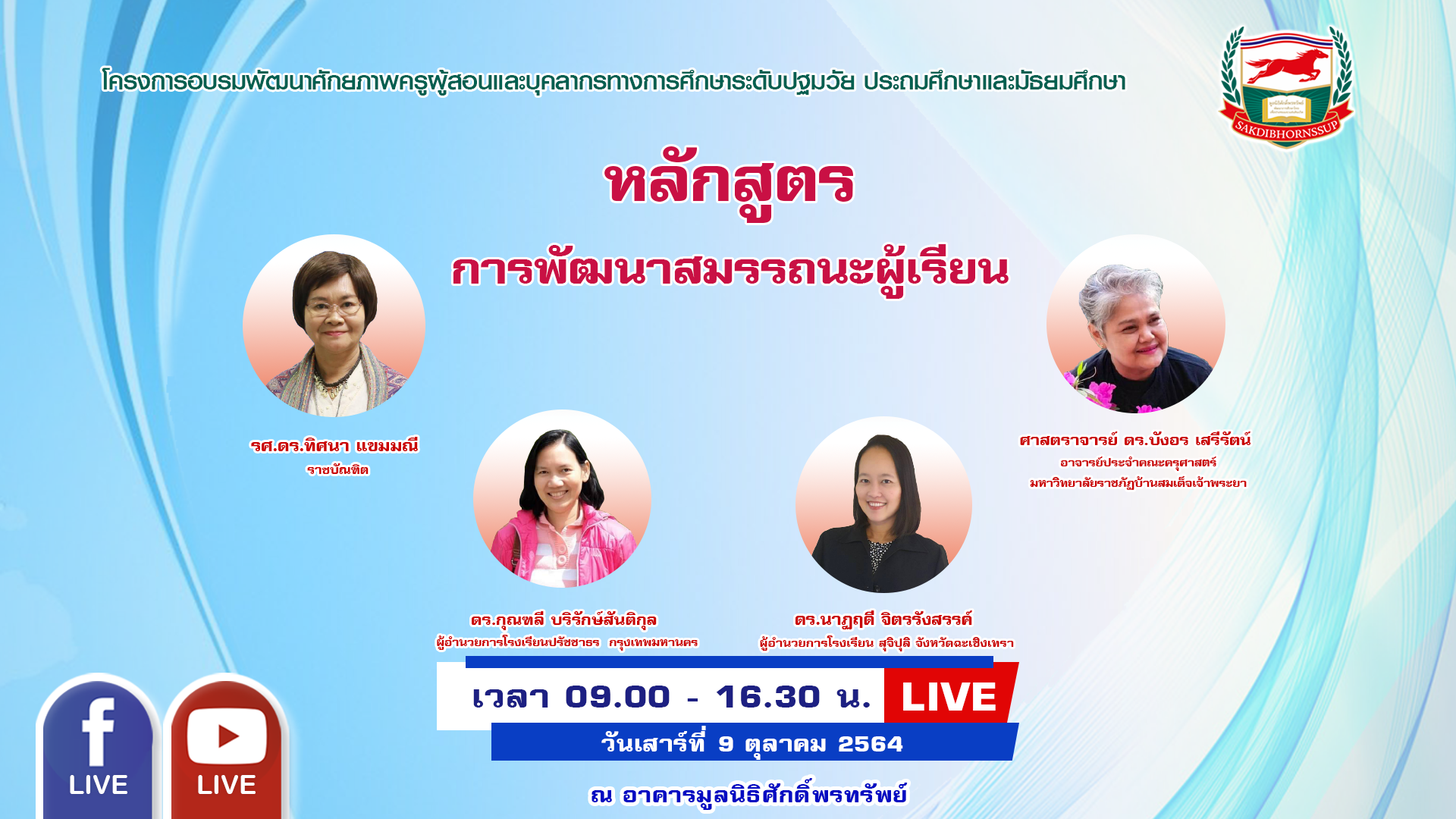 : การพัฒนาสมรรถนะผู้เรียน (สำหรับครู อาจารย์ท่านอื่นๆที่สนใจเข้าร่วมอบรมในครั้งนี้สามารถเข้ามาร่วมเรียนรู้ได้ตลอดหลักสูตรทั้ง2วัน ผ่านfacebook liveของมูลนิธิฯ หลักสูตรนี้จะไม่มีใบรับรองการเข้ารับการอบรมให้ เนื่องจากหลักสูตรนี้เป็นหลักสูตรเฉพาะ