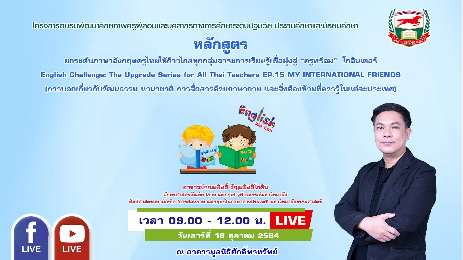 ยกระดับภาษาอังกฤษครูไทยให้ก้าวไกลทุกกลุ่มสาระการเรียนรู้เพื่อมุ่งสู่ “ครูพร้อม” โกอินเตอร์ English Challenge: The Upgrade Series for All Thai Teachers EP.15 MY INTERNATIONAL FRIENDS (การบอกเกี่ยวกับวัฒนธรรม นานาชาติ การสื่อสารด้วยภาษากาย และสิ่งต้องห้ามที่ควรรู้ในแต่ละประเทศ)