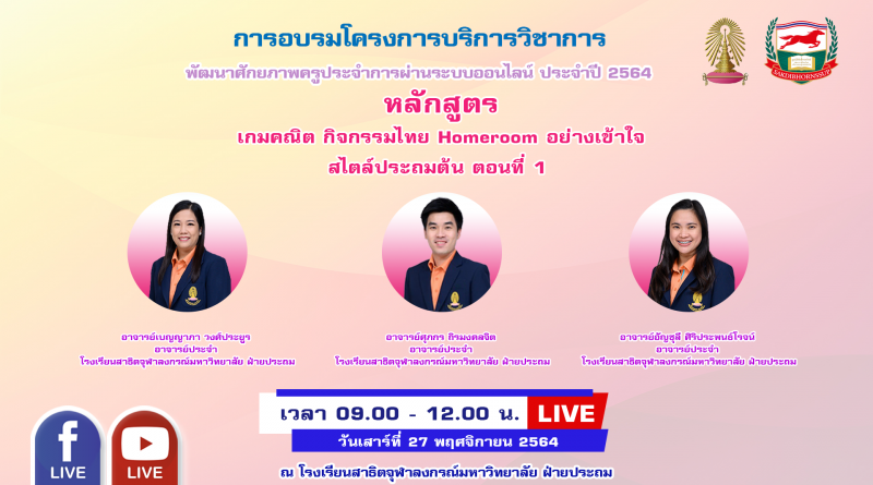 ประกาศรายชื่อผู้เข้าอบรมออนไลน์ : วันเสาร์ที่ 27 พฤศจิกายน 2564 เวลา 09.00-12.00 น. วิทยากร : อาจารย์ศุภกร ถิรมงคลจิต , อาจารย์เบญญาภา วงศ์ประยูร , อาจารย์อัญชุลี ศิริประพนธ์โรจน์