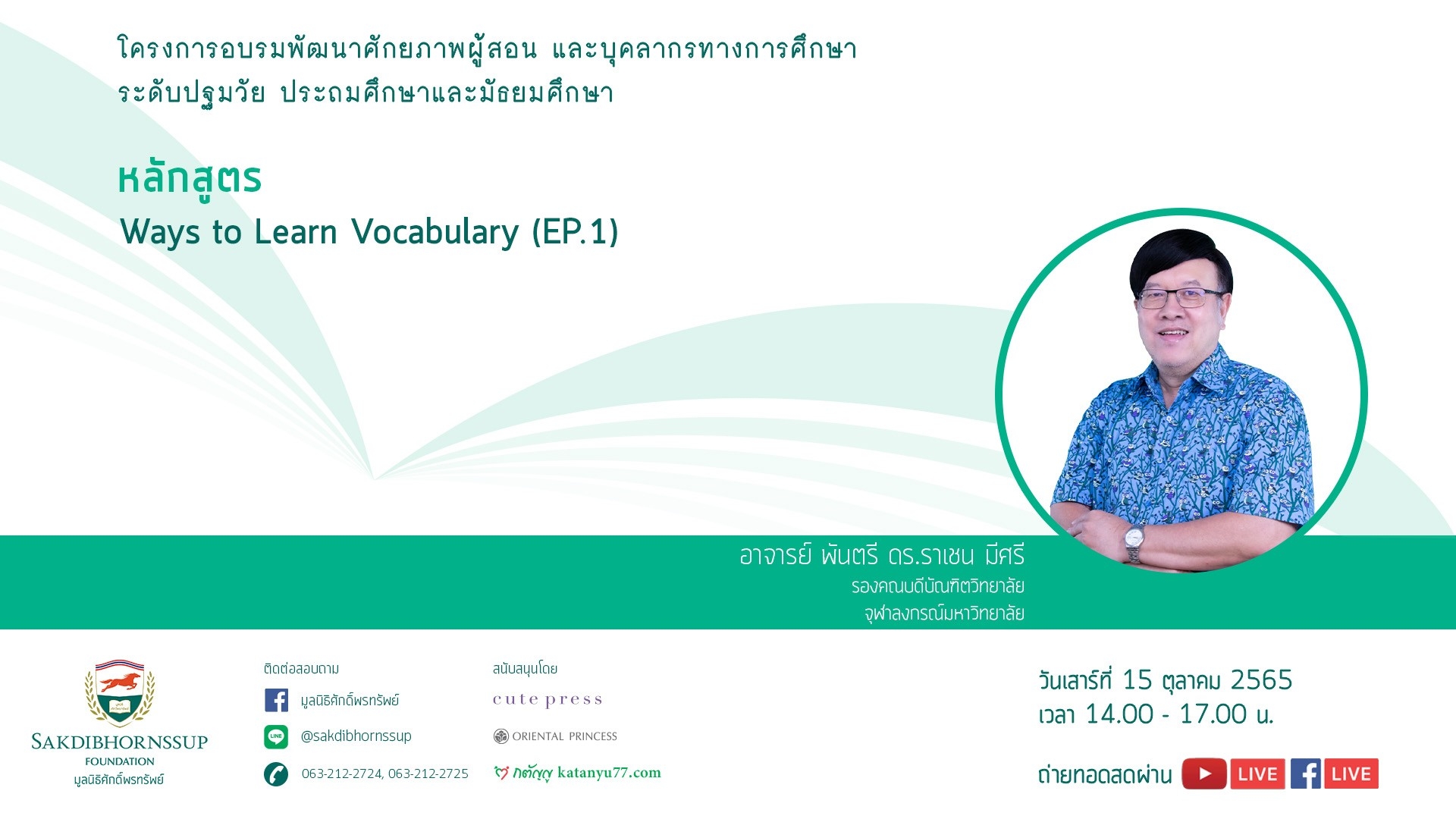ประกาศรายชื่อผู้เข้าอบรมออนไลน์ : วันเสาร์ที่ 15 ตุลาคม 2565 เวลา 14.00 – 17.00 น. วิทยากร: อาจารย์ พันตรี ดร.ราเชน มีศรี