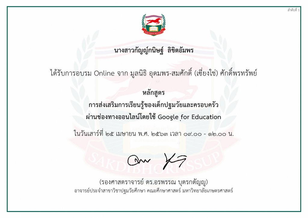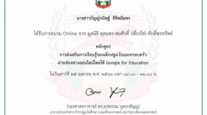 ภาพกิจกรรม หนังสือรับรอง หลักสูตร : การส่งเสริมการเรียนรู้ของเด็กปฐมวัยและครอบครัวผ่านช่องทางออนไลน์โดยใช้ Google for Education : รศ.ดร.อรพรรณ บุตรกตัญญู วันที่ 25 เม.ย. 2563 May 5, 2020May 6, 2020 kusol admin