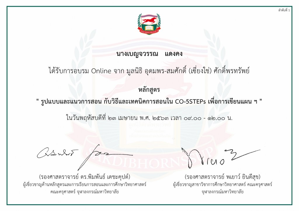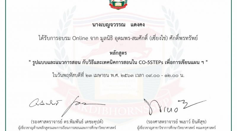 หนังสือรับรอง หลักสูตร : รูปแบบและแนวการสอน กับวิธีและเทคนิคการสอนใน CO-5STEPs เพื่อการเขียนแผน ฯ : รศ.ดร.พิมพันธ์ เดชะคุปต์ รศ.พเยาว์ ยินดีสุข วันที่ 23 เม.ย. 2563