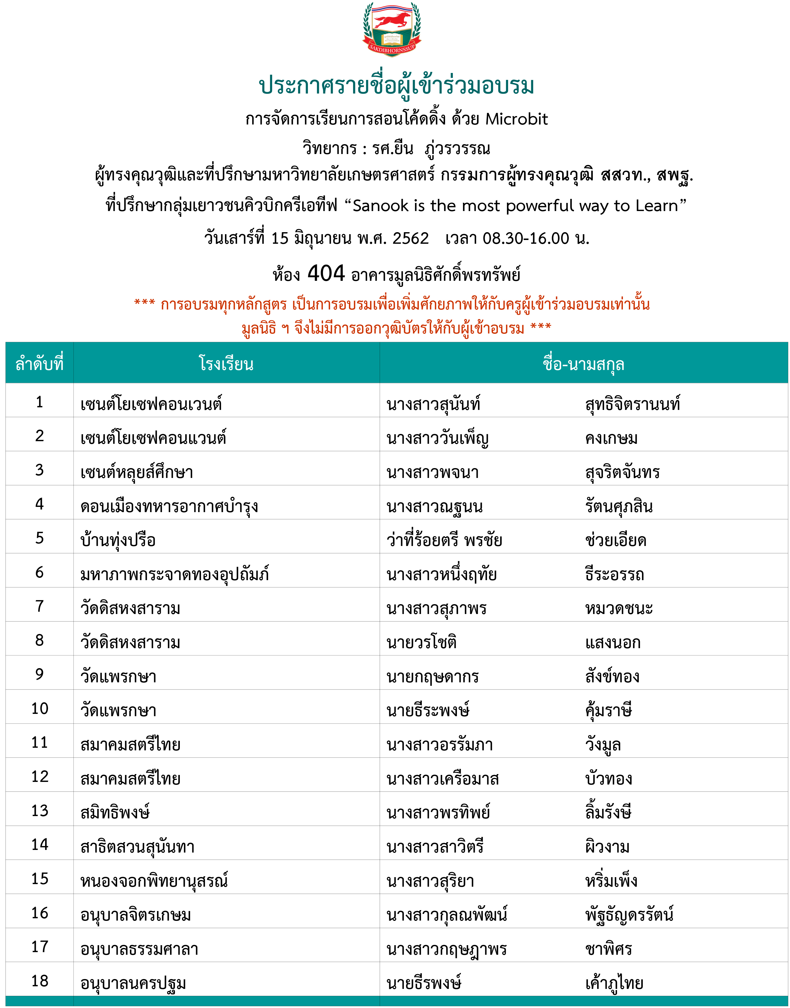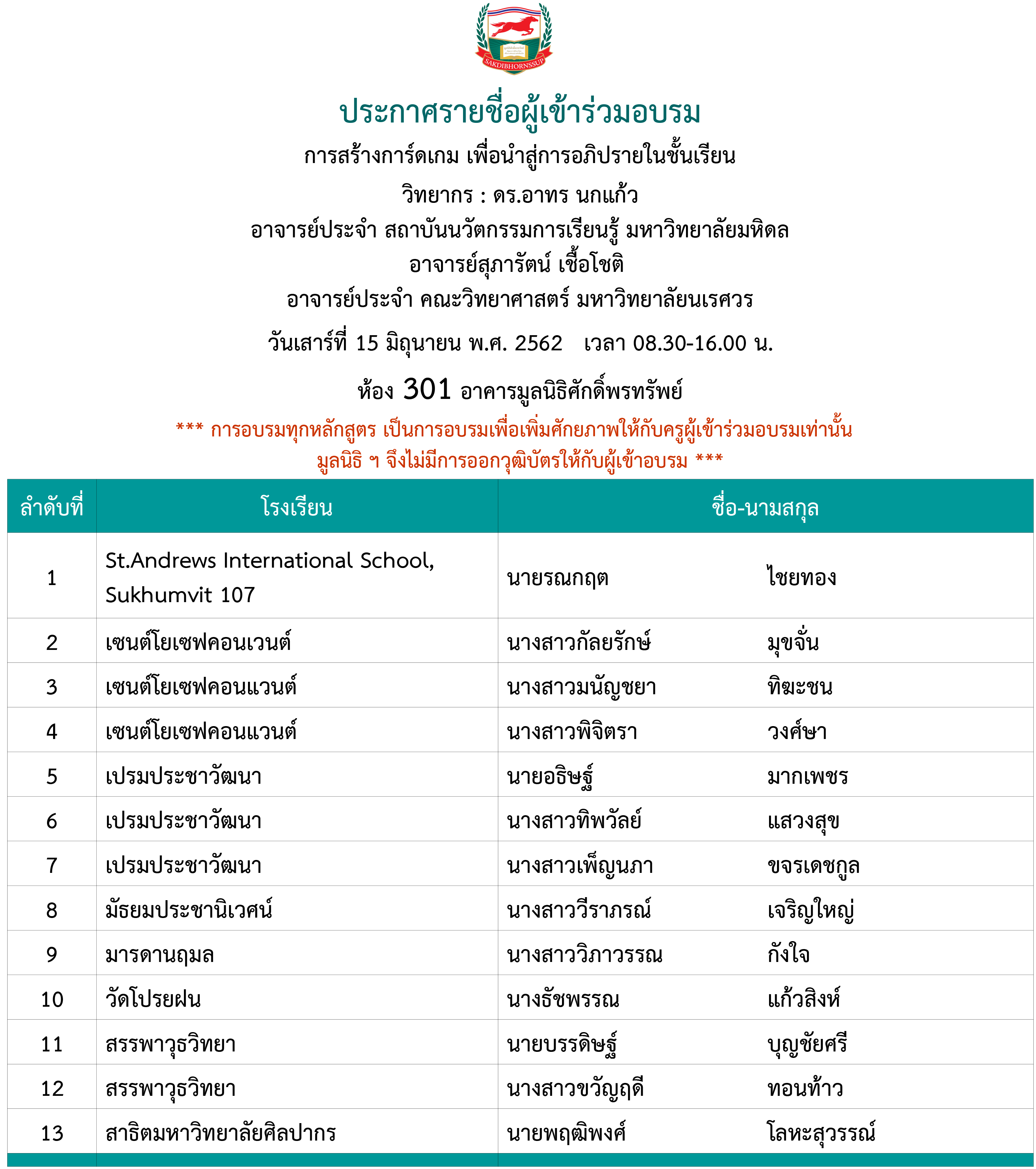 ประกาศรายชื่อ คณาจารย์ผู้เข้าร่วมอบรม วันที่ 15 มิถุนายน 2562