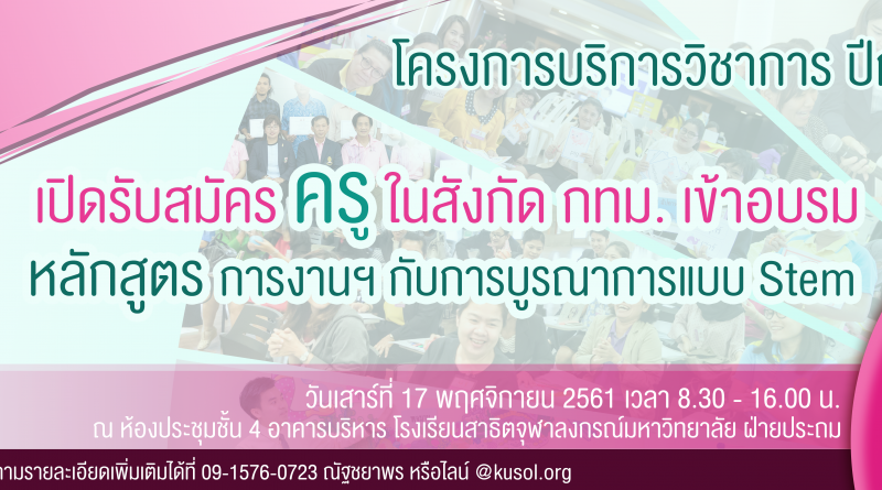 โครงการบริการวิชาการประจำปีการศึกษา 2561 เปิดรับสมัครครูในสังกัด กทม. เข้าอบรม หลักสูตร “การงานฯกับการบูรณาการแบบ Steam” วันเสาร์ที่ 17 พฤศจิกายน 2561 เวลา 8.30 – 16.00 น. ณ ห้องประชุมชั้น