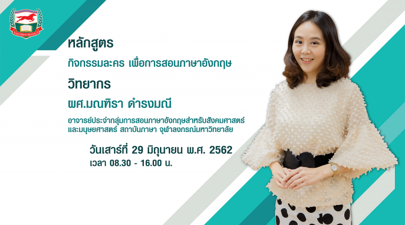 หลักสูตร : กิจกรรมละคร เพื่อการสอนภาษาอังกฤษ วิทยากร : ผศ.มณฑิรา  ดำรงมณี  อาจารย์ประจำกลุ่มการสอนภาษาอังกฤษสำหรับสังคมศาสตร์และมนุษยศาสตร์ สถาบันภาษา จุฬาลงกรณ์มหาวิทยาลัย วันเสาร์ที่ 29 มิถุนายน พ.ศ. 2562 เวลา 08.30-16.00 น. ห้อง 404