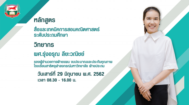 หลักสูตร : สื่อและเทคนิคการสอนคณิตศาสตร์ระดับประถมศึกษา วิทยากร : ผศ.รุ่งอรุณ ลียะวณิชย์  รองผู้อำนวยการฝ่ายแผน งบประมาณและประกันคุณภาพ โรงเรียนสาธิตจุฬาลงกรณ์มหาวิทยาลัย ฝ่ายประถม วันเสาร์ที่ 29 มิถุนายน พ.ศ. 2562 เวลา 08.30-16.00 น. ห้อง 405