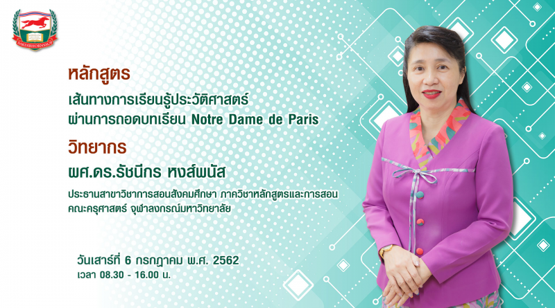 หลักสูตร :  เส้นทางการเรียนรู้ประวัติศาสตร์ผ่านการถอดบทเรียน Notre Dame de Paris วิทยากร : ผศ.ดร.รัชนีกร หงส์พนัส ประธานสาขาวิชาการสอนสังคมศึกษา ภาควิชาหลักสูตรและการสอน คณะครุศาสตร์ จุฬาลงกรณ์มหาวิทยาลัย วันเสาร์ที่ 6 กรกฎาคม พ.ศ. 2562 เวลา