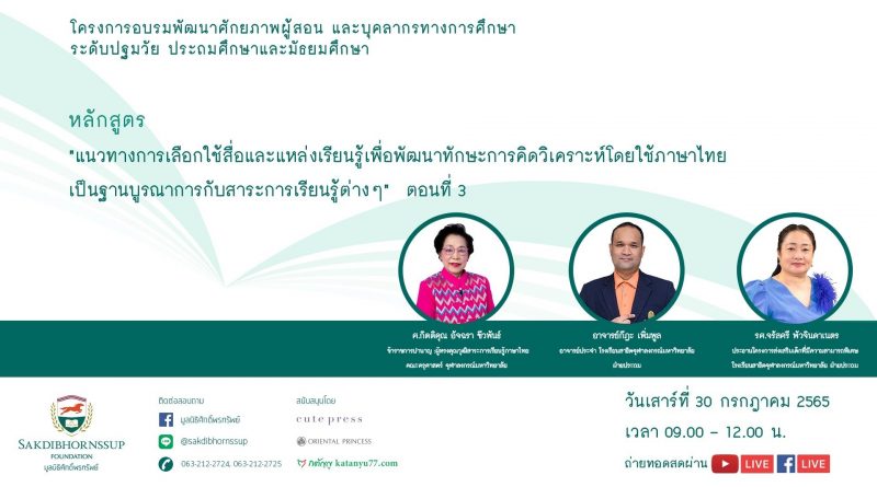 วันเสาร์ที่ 30 กรกฎาคม 2565 เวลา 9.00-12.00 น. “แนวทางการเลือกใช้สื่อและแหล่งเรียนรู้เพื่อพัฒนาทักษะการคิดวิเคราะห์โดยใช้ภาษาไทยเป็นฐานบูรณาการกับสาระการเรียนรู้ต่างๆ” ตอนที่ 3 ประกาศรายชื่อ 👉 คลิก หรือ Scan QR Code