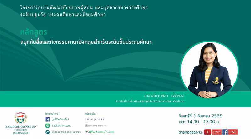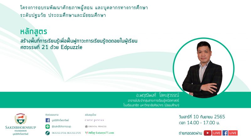 วันเสาร์ที่ 10 กันยายน 2565 เวลา 14.00 – 17.00 น. วิทยากร : อาจารย์พฤฒิพงศ์ โลหะสุวรรณ์ หลักสูตร : สร้างพื้นที่การเรียนรู้เพื่อฟื้นฟูภาวะการเรียนรู้ถดถอยในผู้เรียนศตวรรษที่ 21 ด้วย Edpuzzle ประกาศรายชื่อ 👉👉 คลิก